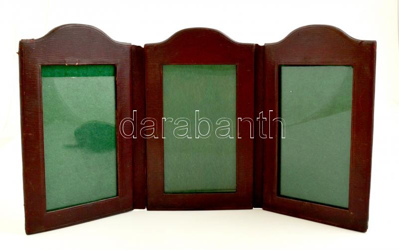 Beschreibung: Három férőhelyes bőr fényképtartó nagyméretű fényképeknek, összecsukva: 27,5×17×3,5 cm, kinyitva: 27,5×52 cm