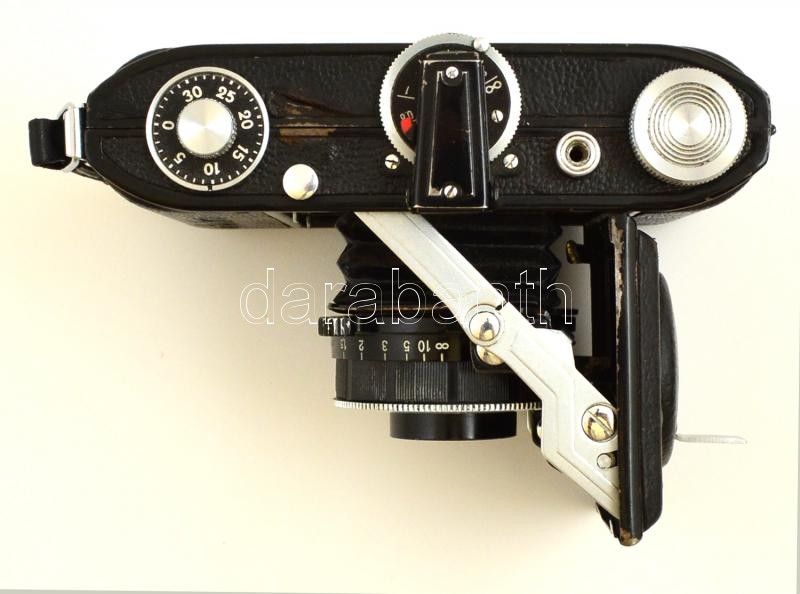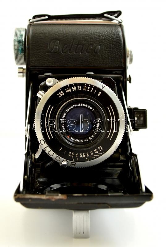 cca 1950 Belca Beltica fényképezőgép Carl Zeiss Jena Tessar objektívvel, jó állapotban, bőr tokban / cca 1950 Belca Beltica folding camera with Carl Zeiss Jena Tessar lens, in good condition with leather case