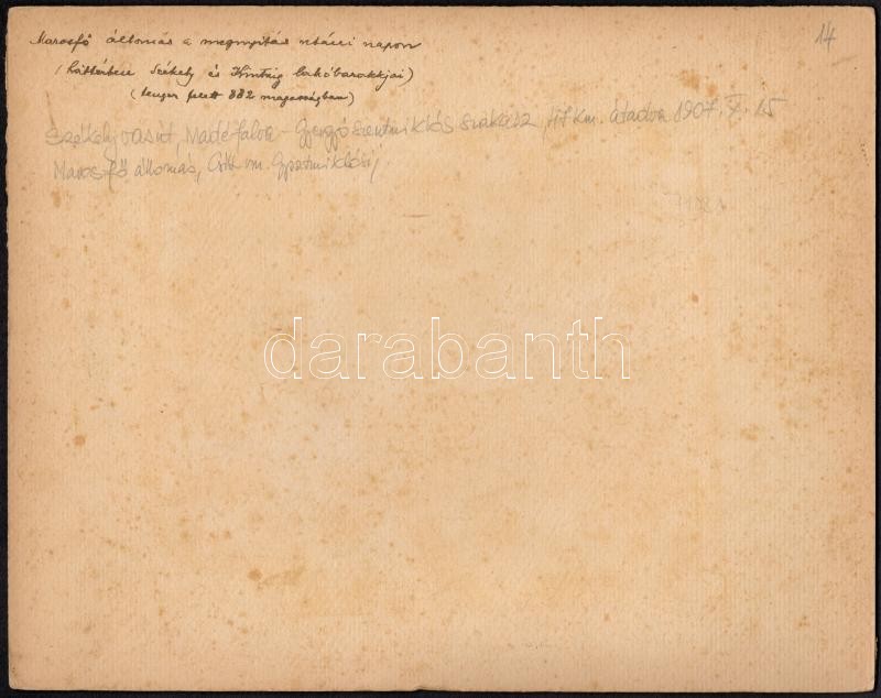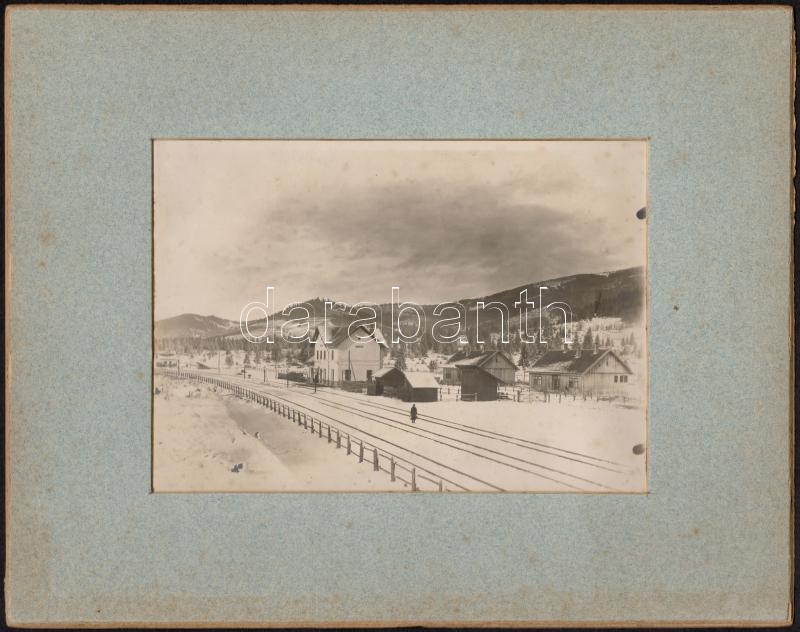 1907 Marosfő vasútállomás az átadás utáni napon, háttérben az építő cég barakkjai. Székely vasút. / Marosfő railway station on the 2nd day after the opening. 18x13 cm