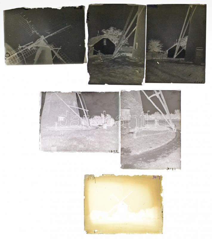 Beschreibung: 1916 Képriport egy kiskunfélegyházi szélmalomról, 6 db vintage üveglemez negatív Kerny István (1879-1963) hagyatékából, feliratozva, 4x6 cm