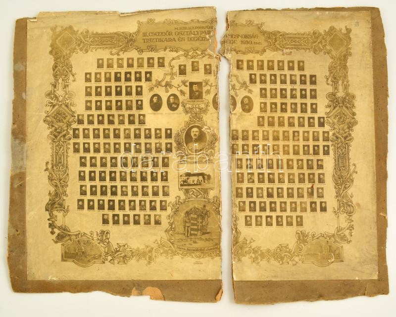 1930 "A magyar királyi kaposvári III. csendőr osztályparancsnokság tisztikara és legénysége", tablókép, kartonra ragasztva, kettészakadt, megviselt állapotban, 40×50 cm