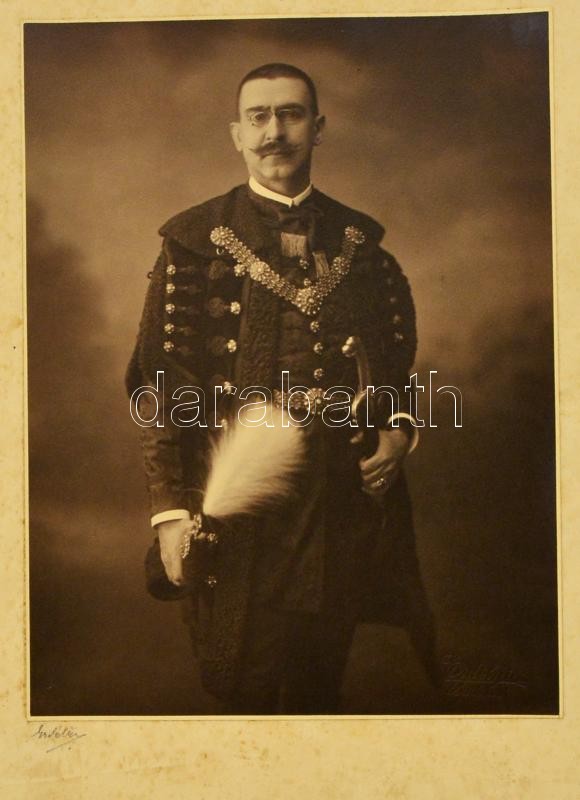 Beschreibung: Viski Illés (Illyasevics) József (1871-1944) jogász díszmagyarban, Erdélyi aláírt, hidegpecséttel jelzett fotója, kartonra kasírozva, 19,5x14,5 cm
