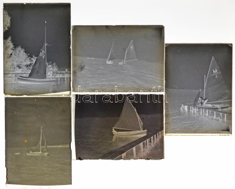 Beschreibung: cca 1930 Balatoni vitorlások, 5 db korabeli üveglemez negatív, 9x6,5 cm