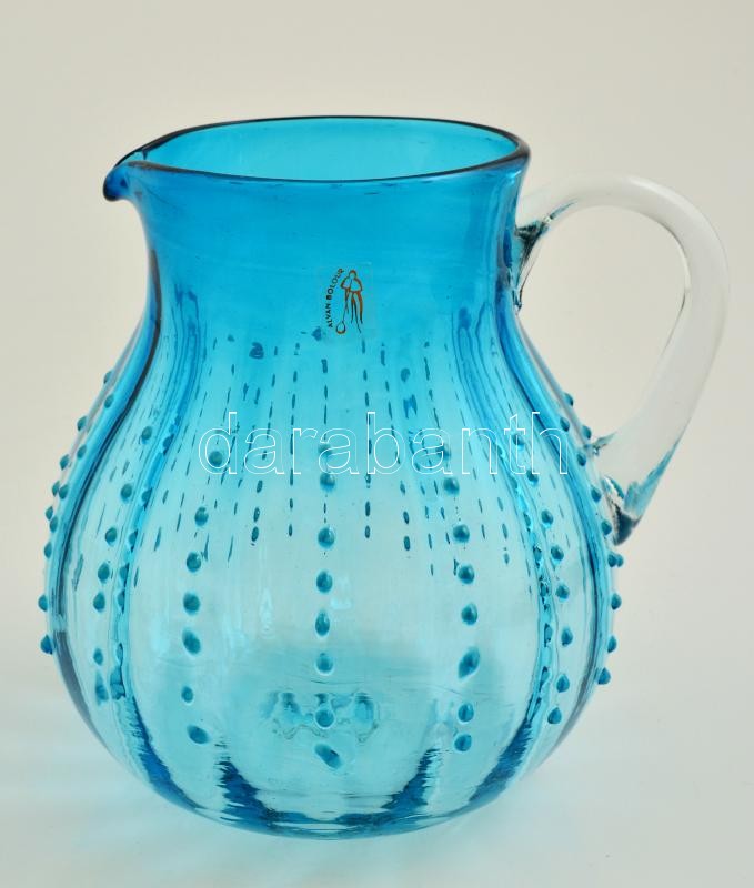 Kék színű üveg kancsó, szakított, anyagában színezett, matricával jelz... https://www.darabanth.com/de/302-Fernauktion/302.0/Andere-Sammelgebiete/Glaser~500019/Kek-szinu-uveg-kancso-szakitott-anyagaban-szinezett-matricaval-jelzett-hibatlan-m-18~II1623099