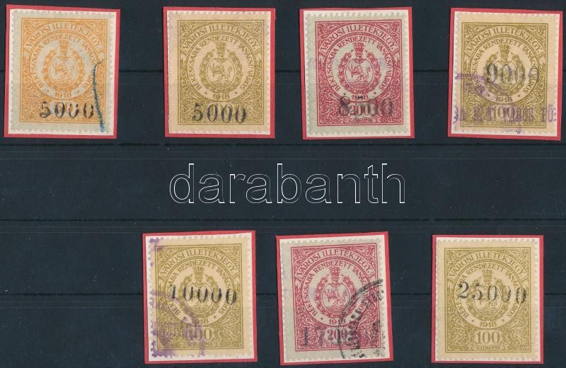 Beschreibung: 1925-26 Békéscsaba városi illetékbélyeg 7 klf felülbélyegzett példánya (11.600)