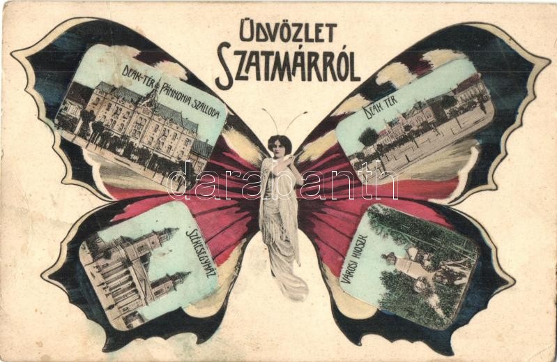 Szatmárnémeti, Szatmár, Satu Mare; Deák tér, Pannónia szálloda, székesegyház, Városi kioszk, pillangó hölgy, kiadja Weisz Izsák / square, hotel, cathedral, kiosk, butterfly lady (Rb)