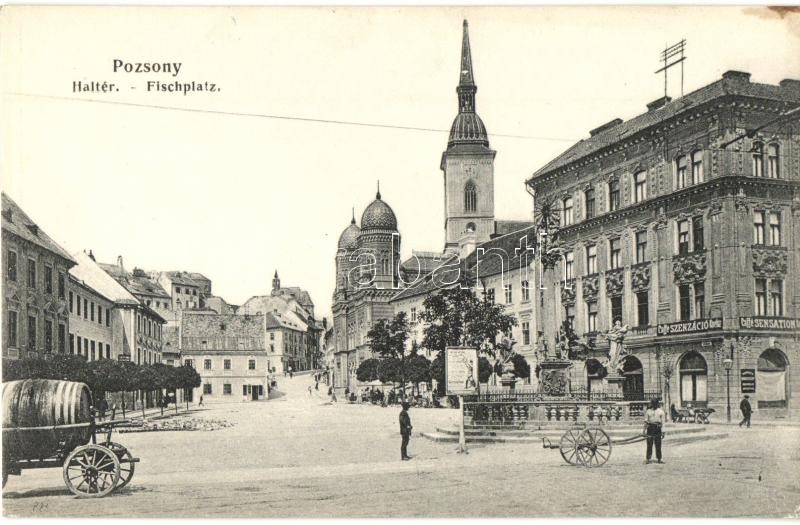 Beschreibung: Pozsony, Pressburg, Bratislava; Hal tér, Szenzáció kávéház, zsinagóga, izraelita templom / Fischplatz / square, café, synagogue. L. & P. P. 1267. (EK)