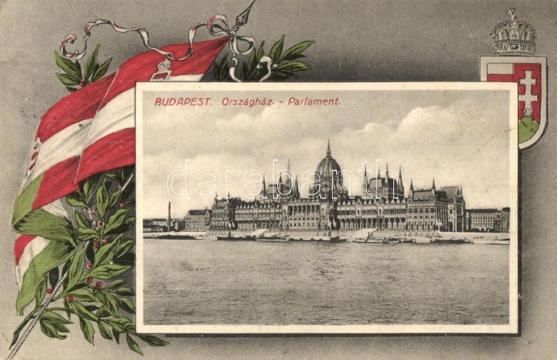 Budapest V. Országház. Magyar zászlós és címeres keret https://www.darabanth.com/de/302-Fernauktion/302.0/Ansichtskarten/Ungarn~300006/Budapest-V-Orszaghaz-Magyar-zaszlos-es-cimeres-keret~II1623723
