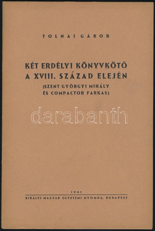 Tolnai Gábor: Két erdélyi könyvkötő a XVIII. század elején. (Szent Györgyi Mihály és Compactor Farkas.) Bp., 1941, Kir. Magyar Egyetemi Nyomda. Kiadói papírkötésben.