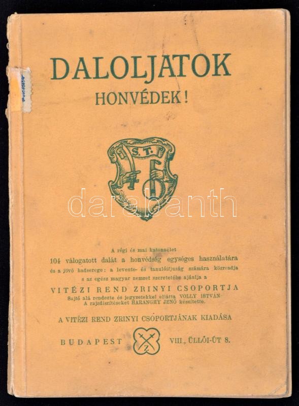 Daloljatok honvédek! Magyar katonanóták gyüjteménye. 104 katonadal. Sajtó alá rendezte és jegyzetekkel ellátta Volly István. A rajzokat Haranghy Jenő készítette. Bp., 1939, Vitézi Rend Zrínyi Csoportja, 119 p. Kiadói papírkötés, kissé sérült gerinccel, és kötéssel.