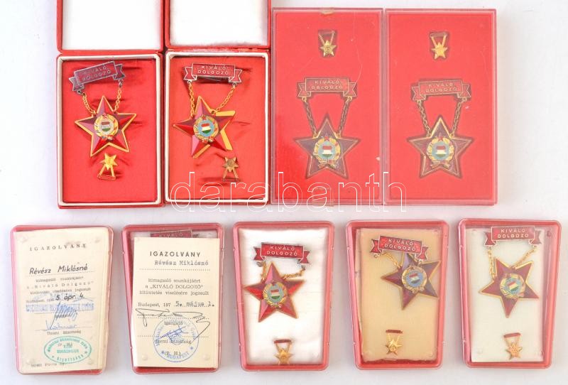 Beschreibung: ~1970-1980. 9db "Kiváló Dolgozó" jelvény, miniatűrrel, eredeti tokban, néhány darab igazolvánnyal együtt T:2