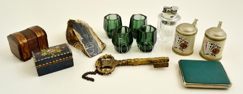 Beschreibung: Érdekes bolha tétel: mini korsók, fa dobozok, dugóhuzó, kupicás poharak, stb, összesen: 12 db