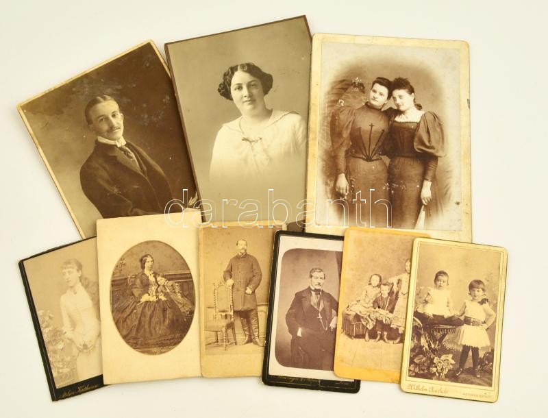 cca 1890-1900 Vegyes keményhátú fotó tétel, 9 db, egy részük a hátoldalakon feliratozva, közte egy nevesített személlyel, egy foltos, viseltes, 18x11 cm és 10x6 cm.