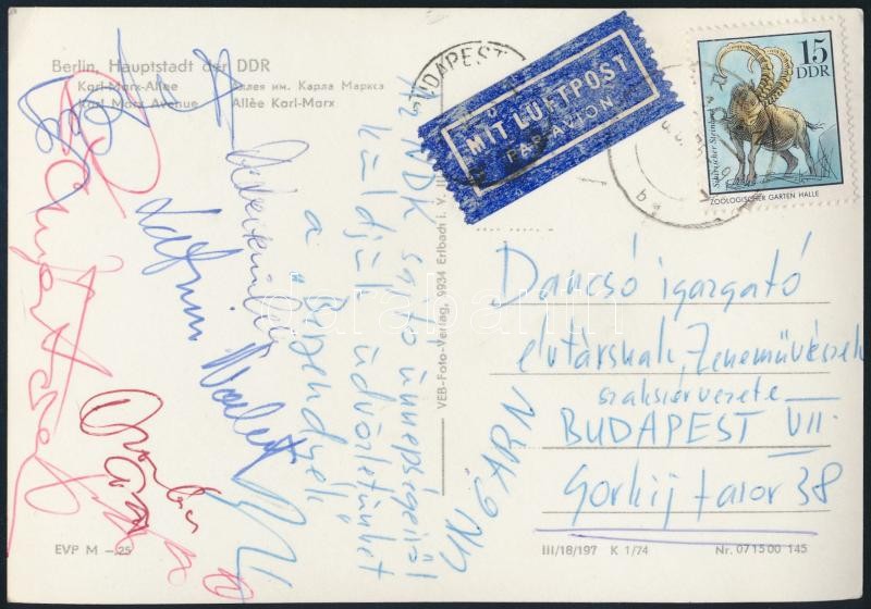 cca 1970 A külföldön turnézó Bergendy zenekar tagjai által aláírt és hazaküldött képeslapja Dancsó István, az Országos Szórakoztatózenei Központ igazgatójának címezve.