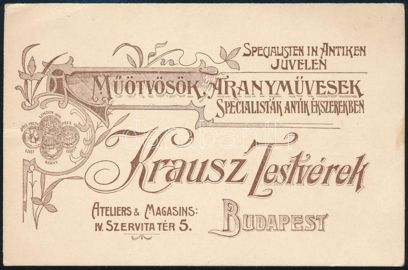 Krausz Testvérek műötvösök, aranyművesek, specialisták antik ékszerekb... https://www.darabanth.com/de/303-Fernauktion/303.0/Andere-Sammelgebiete/Werbungen~32/Krausz-Testverek-muotvosok-aranymuvesek-specialistak-antik-ekszerekben-reklam-kartya-8x~II1634135