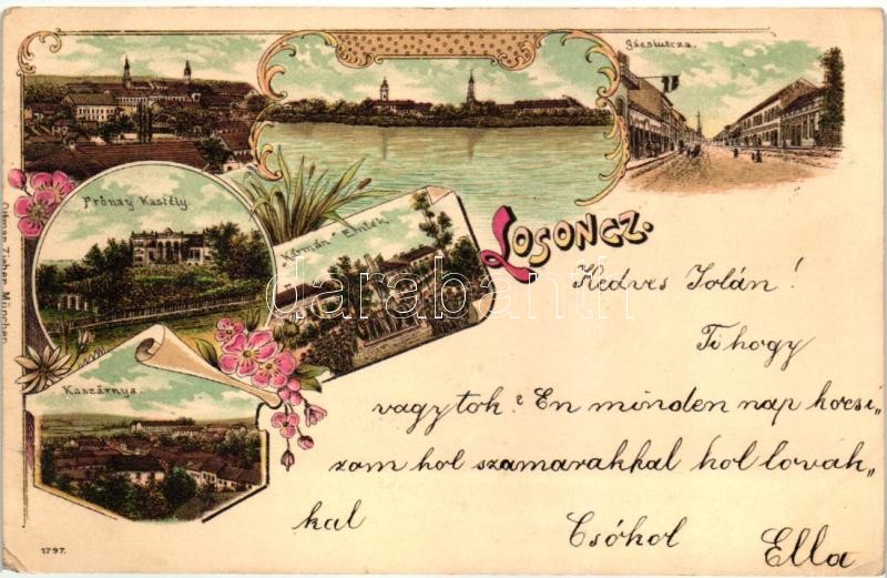 1899 Losonc, Lucenec; Prónay kastély, Kármán emlék, kaszárnya, Gáesi utca. Ottmar Zieher / caslte, military barracks, monument, street view. Floral, Art Nouveau, litho (EK)