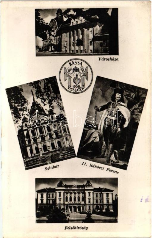 1938 Kassa, Kosice; visszatért, városháza, színház, felsőbíróság, II. ... https://www.darabanth.com/de/303-Fernauktion/303.0/Ansichtskarten/Slowakei~200007/1938-Kassa-Kosice-visszatert-varoshaza-szinhaz-felsobirosag-II-Rakoczi-Ferenc-to~II1633083