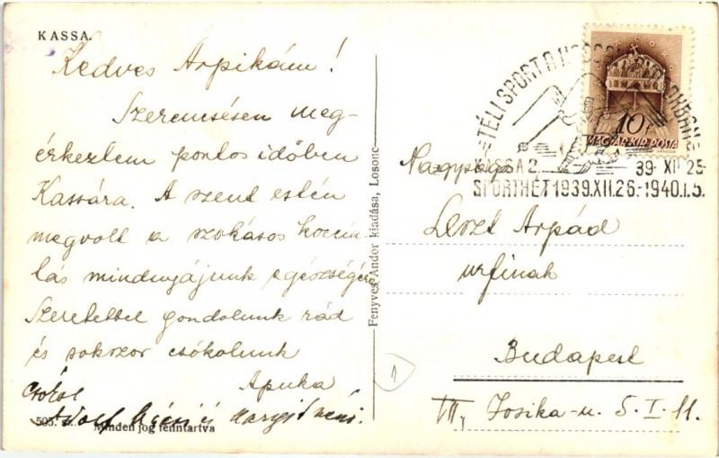 Beschreibung: 1938 Kassa, Kosice; visszatért, városháza, színház, felsőbíróság, II. Rákóczi Ferenc / town hall, theatre, court "1939 Téli Sporthét" So. Stpl