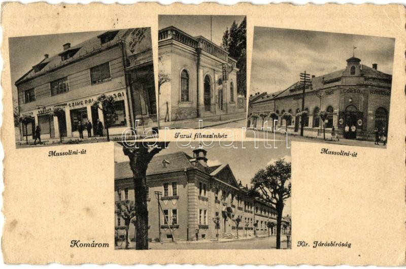 Komárom, Komárno; Mussolini út, Czike Pál üzlete, Turul filmszínház, mozi, Corso kávéház, Kir. Járásbíróság. Gárdony és Fenyvesi kiadása / street view, shops, cinema, café, court (EB)