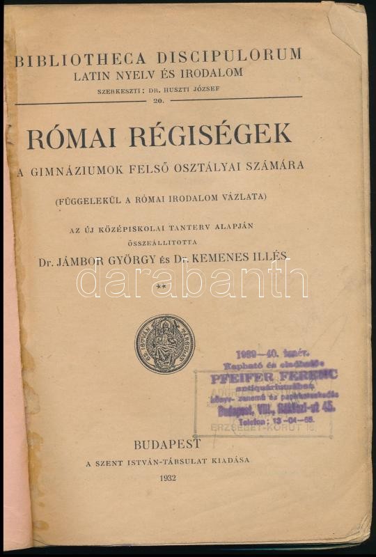 Dr. Jámbor György, Dr. Kemenes Illés: Római régiségek. A gimnáziumok felső osztályai számára. (Függelékül a római irodalom vázlata.) Bibliotheca Discipulorum 20. Bp.,1932, Szent István-Társulat. Átkötött korabeli papírkötés, kissé viseltes gerinccel.