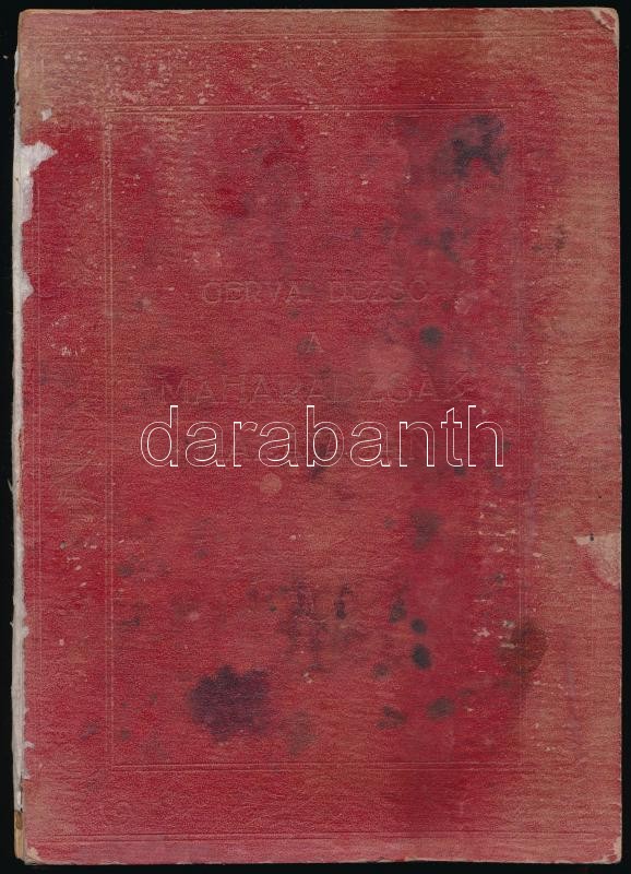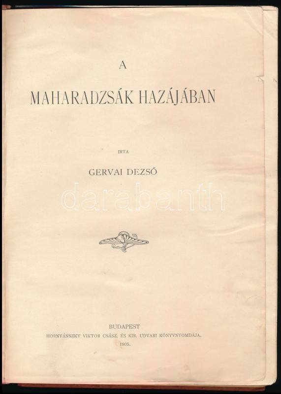 Gervai Dezső: A Maharadzsák hazájában. Bp., 1905, Hornyánszky Viktor. Kiadói egészvászon-kötés, megviselt állapotban, hiányzó gerinccel, de a könyvtest egyben van, a borítója foltos, kopott.
