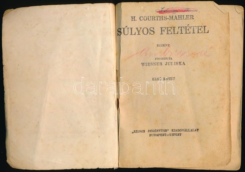 H. Courths Mahler: Sulyos feltétel I. Fordította Wiesner Juliska. Szín... https://www.darabanth.com/de/303-Fernauktion/303.0/Bucher/Bucher-und-Dokumente-mit-gunstigem-Preis~500017/H-Courths-Mahler-Sulyos-feltetel-I-Forditotta-Wiesner-Juliska-Szines-regenytar-Bp-Ujpest-~II1630355