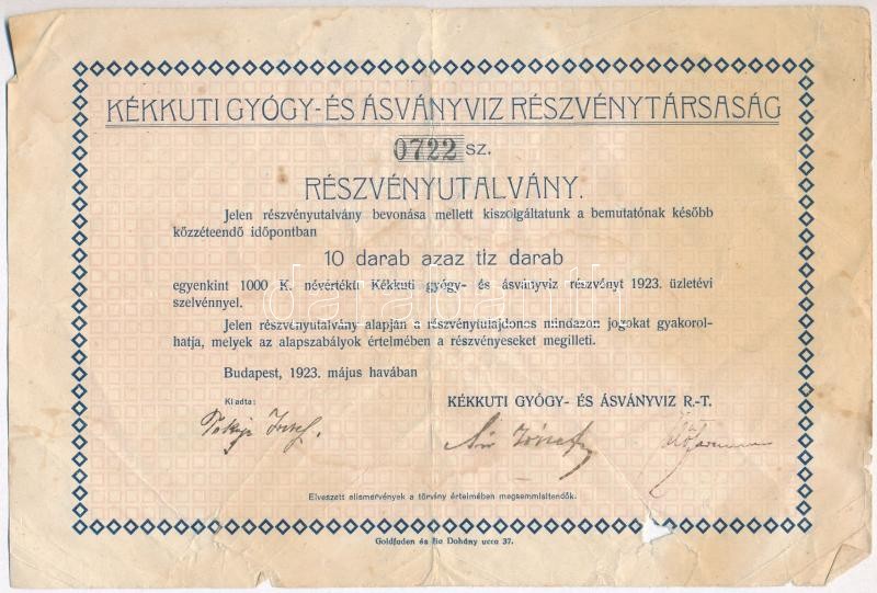 Budapest 1923. "Kékkuti Gyógy- és Ásványvíz Részvénytársaság"... https://www.darabanth.com/de/303-Fernauktion/303.0/Numismatik/Aktien-und-Tickets~300005/Budapest-1923-Kekkuti-Gyogy-es-Asvanyviz-Reszvenytarsasag-reszvenyutalvany-10000K-~II1633550