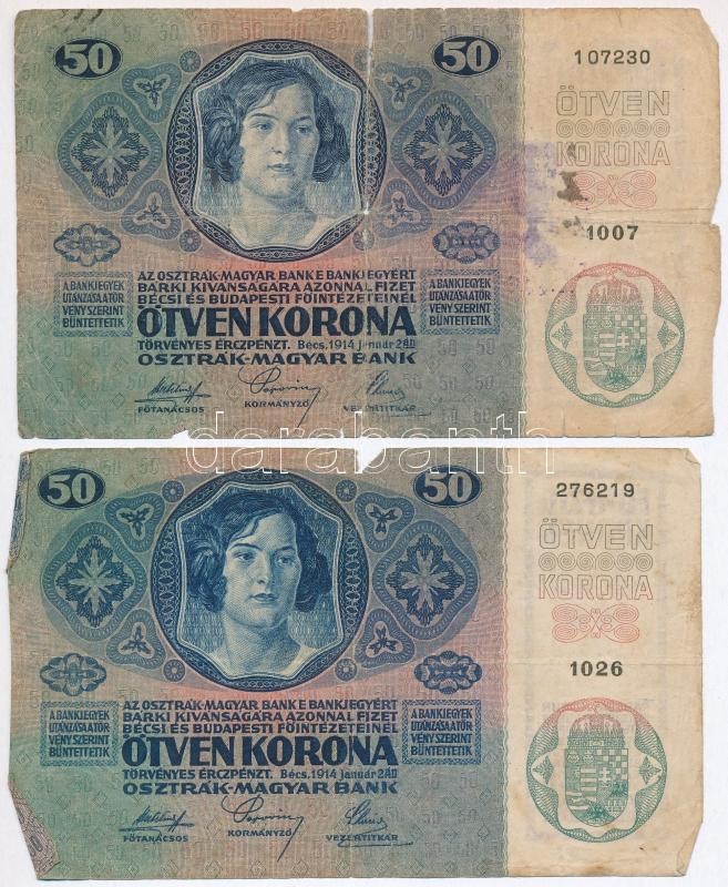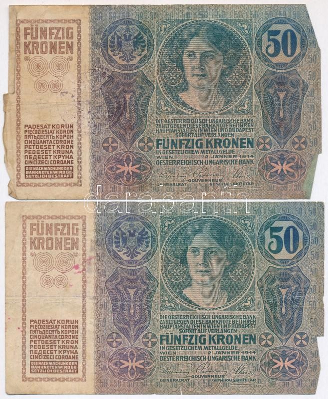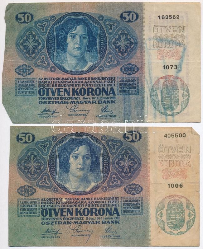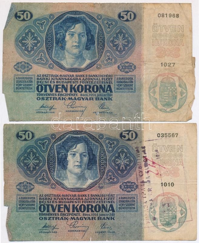 1914. 50K (6x) több darabon kiolvashatatlan felülbélyegzéssel T:III-IV... https://www.darabanth.com/de/303-Fernauktion/303.0/Numismatik/Ungarische-Banknoten~300007/1914-50K-6x-tobb-darabon-kiolvashatatlan-felulbelyegzessel-TIII-IV---Adamo-K24~II1630543