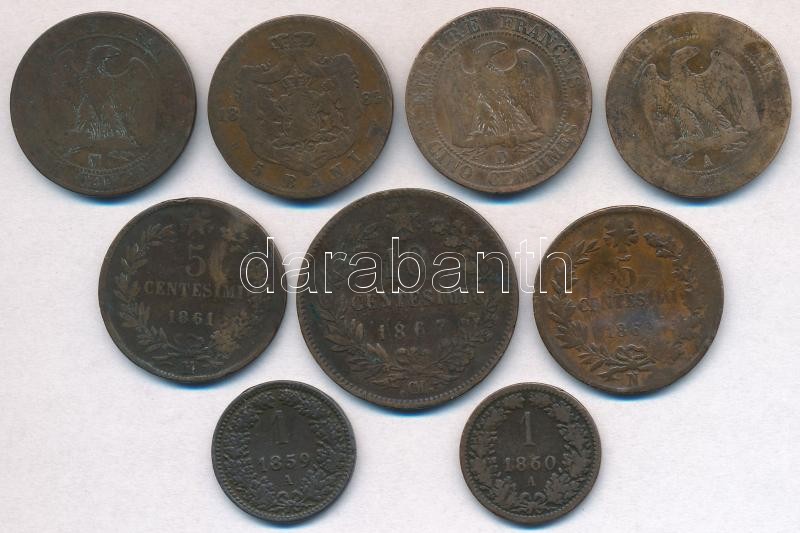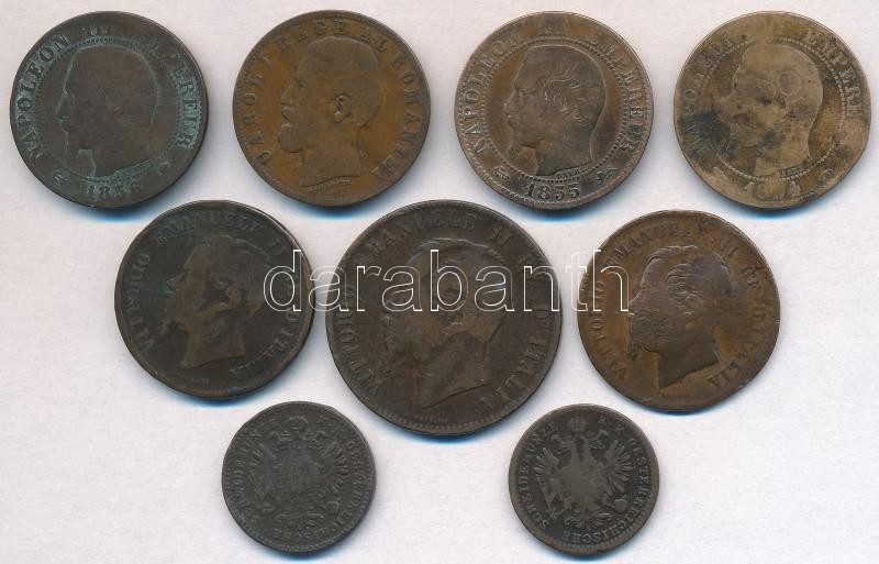 9db-os vegyes külföldi réz- és bronzpénz tétel, közte Ausztria 1859A 1kr Cu; Franciaország / Második Császárság 1855D 5c Br "III. Napóleon"; Románia 1882B 5b Cu T:2-,3 ü.