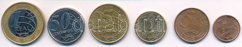 Brazil 2003. 1 Centavo Cu-Steel + 2003. 5 Centavos Cu-Steel + 2004. 10 Centavos Br-Steel + 2003. 25 Centavos Br-Steel + 2002. 50 Centavos Cu-Ni + 2002. 1 Real Br-Steel C:AU,XF