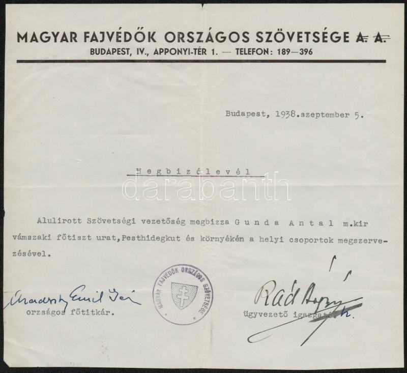 Beschreibung: 1938 Magyar Fajvédők Országos Szövetsége megbízólevél Hidegkút környéki helyi csoportok szervezésére
