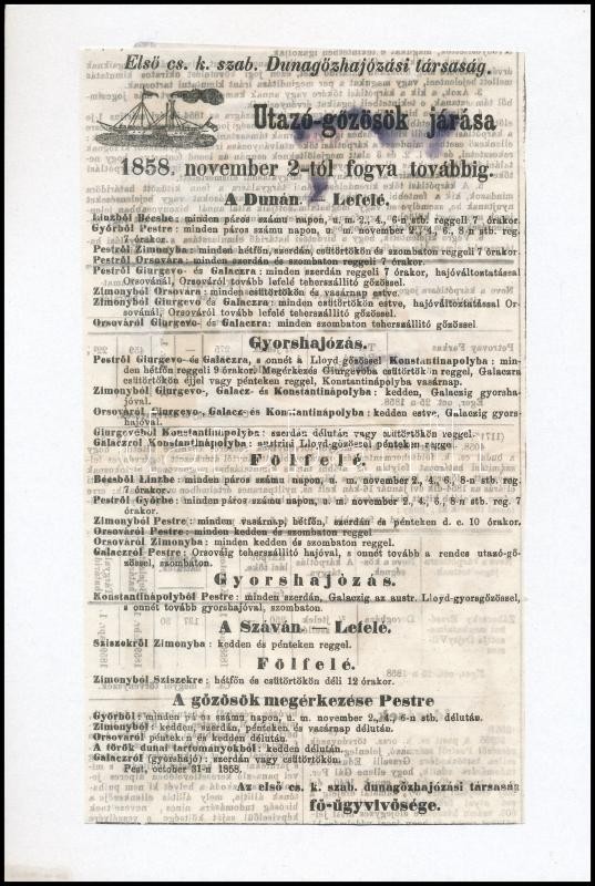 1858 Dunai gőzösök menetrendje Kivágás kartonon https://www.darabanth.com/de/304-Fernauktion/304.0/Andere-Sammelgebiete/Drucksachen~28/1858-Dunai-gozosok-menetrendje-Kivagas-kartonon~II1636881