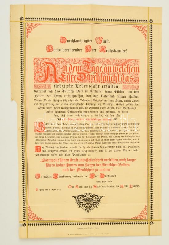 Beschreibung: 1885 A lipcsei városi tanács díszes nyomtatott köszöntő oklevele Bismarck 70. születésnapja alkalmából