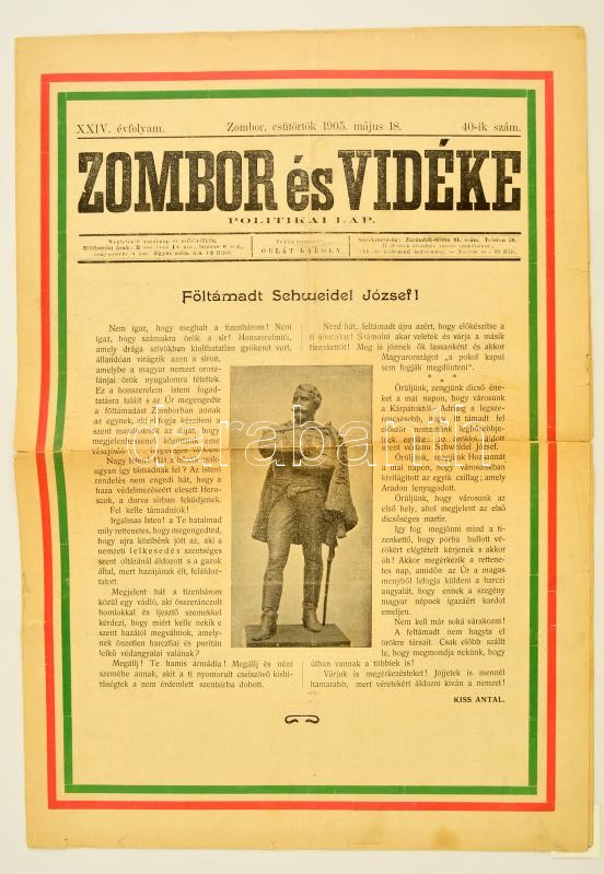 1905 A Zombor és vidéke politikai lap 1848-as forradalomra emlékező kü... https://www.darabanth.com/de/304-Fernauktion/304.0/Andere-Sammelgebiete/Drucksachen~28/1905-A-Zombor-es-videke-politikai-lap-1848-as-forradalomra-emlekezo-kulonszama-szakadasokkal~II1635792