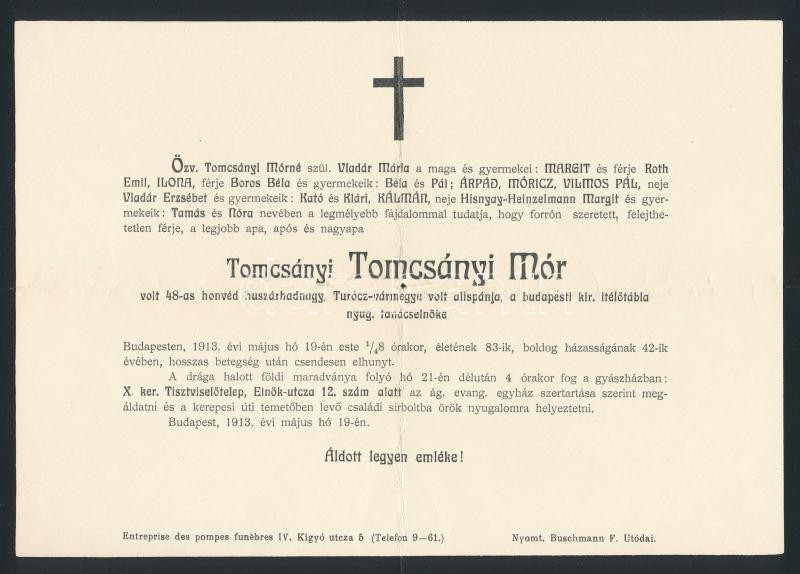 1913 Tomcsányi Mór 1848-as huszárhadnagy, Túróc vármegye alispánjának ... https://www.darabanth.com/de/304-Fernauktion/304.0/Andere-Sammelgebiete/Drucksachen~28/1913-Tomcsanyi-Mor-1848-as-huszarhadnagy-Turoc-varmegye-alispanjanak-halotti-ertesitoje~II1635813