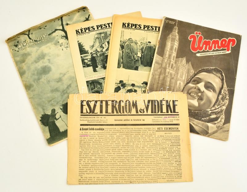 1938 Vegyes a felvidék visszatérésével foglalkozó korabeli nyomtatvány tétel, 5 db, (Ünnep V. évf. 22. sz., Esztergom és vidéke 59. évf. 87. sz., Nemzeti Ujság 1938. november 20., Képes Hírlap LXI. évf. 152.,188. szám), változó, többnyire szakadozott állapotban.