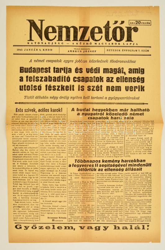Beschreibung: 1945 január 9. A Nemzetőr c. nyilas újság, utolsó Budapesten megjelent száma. Restaurált
