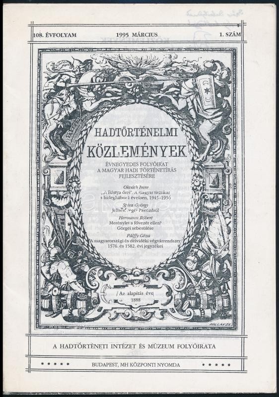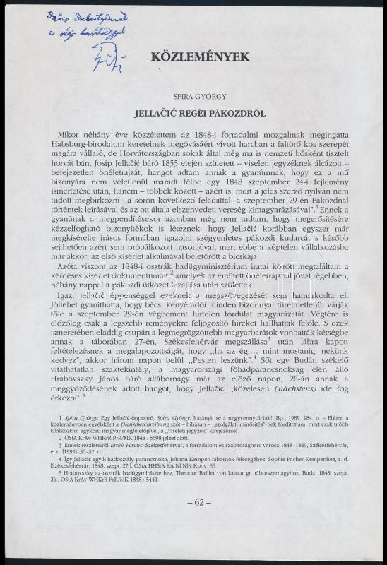Spira György: Jellacic regéi Pákozdról. In: Hadtörténeti közlemények 108. évf. 1. szám. 1995. március. Papírkötés, 62-87 p. Spira György (1925-2007) dedikációjával Szőcs Sebestyénnek. (1938-1996)