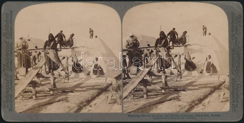 Beschreibung: cca 1900 Oroszország, Fekete-tenger partján sólepárlás eredménye prizmába gyűjtve, sztereó papírpozitív képpár, több nyelven feliratozva, 9x18 cm