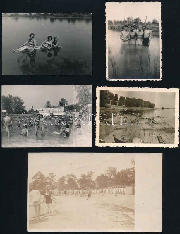 Beschreibung: cca 1930-1940 "Nekem a Balaton a Riviéra..." 5 db fürdőéletet ábrázoló fotó, egy részük hátulján feliratozva, különböző méretben