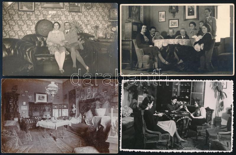 Beschreibung: cca 1930 Enteriőrök, családi csoportképek, 4 db fotó, egy részük hátulján feliratozva, 9×14 cm