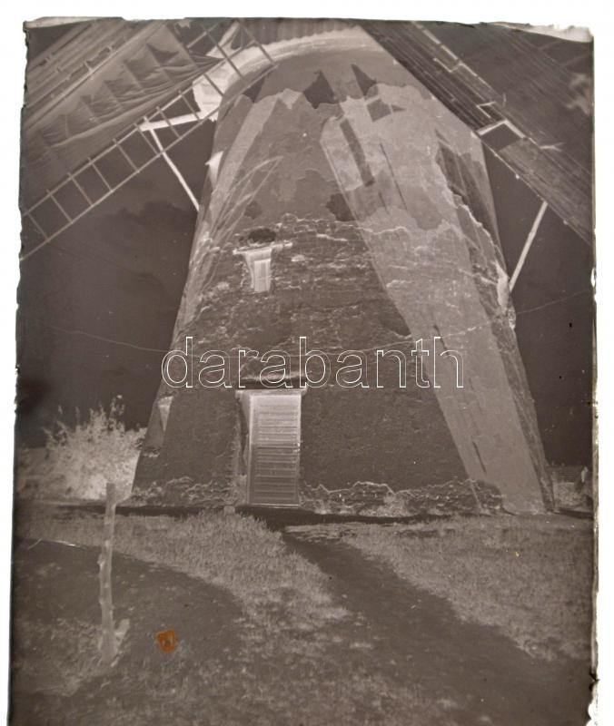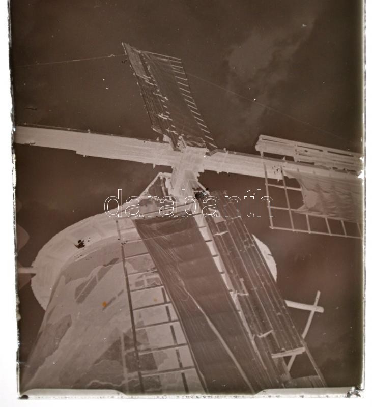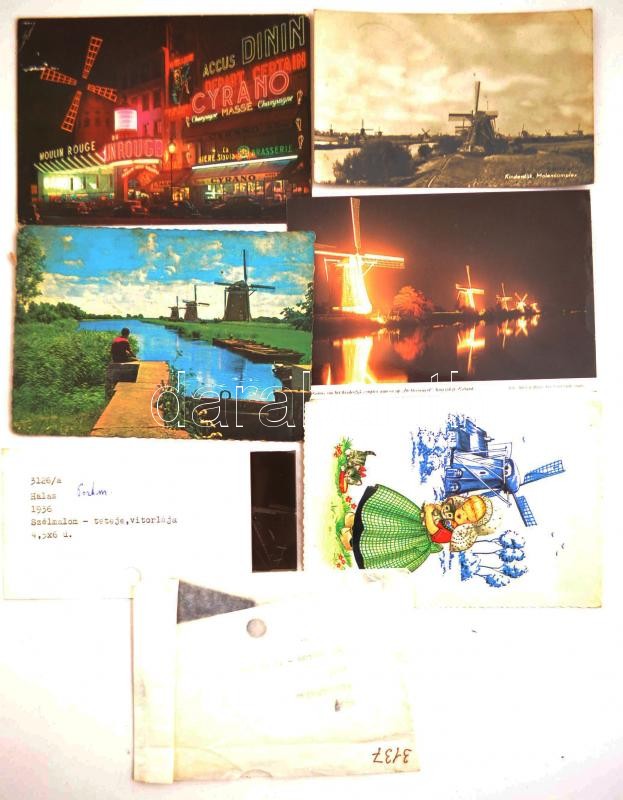 cca 1936 Szélmalmok, 2 db üveglemez negatív Kerny István hagyatékából, hozzáadva 5 db modern képeslapot szélmalom motívummal, 4x6 cm és 10x15 cm között