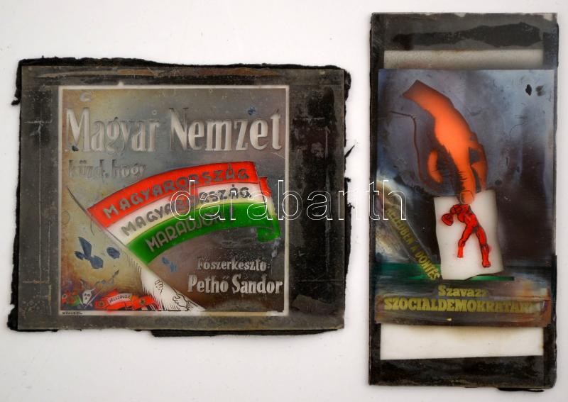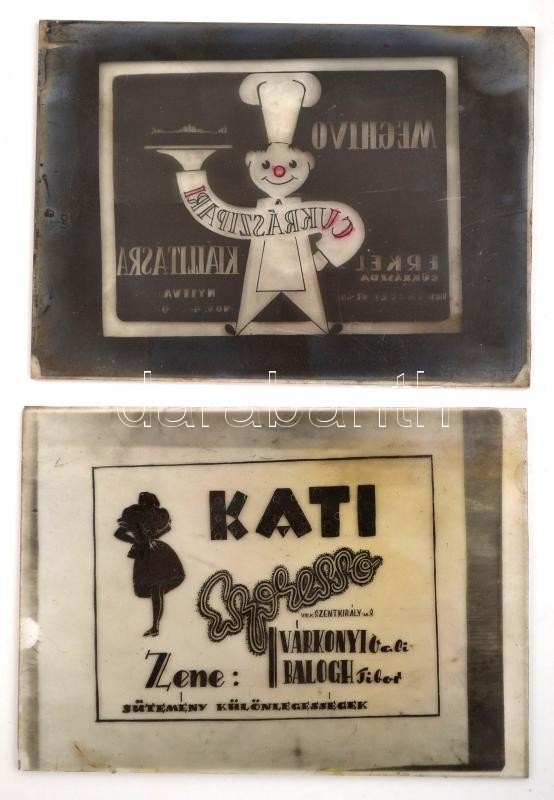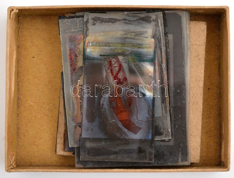 cca 1947 Fekete György (1904-1990) budapesti fényképész reklámgrafikái különféle szolgáltatásokról, termékekről, 13 db mozikban vetíthető üveglemez diapozitív üveglemez, 6x4 cm és 8x8 cm között