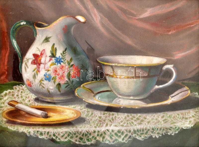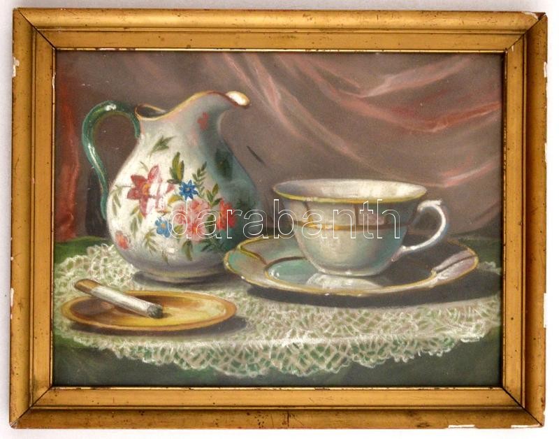 Beschreibung: Jelzés nélkül: Asztali csendélet. pasztell, papír, üvegezett keretben, 28×36 cm