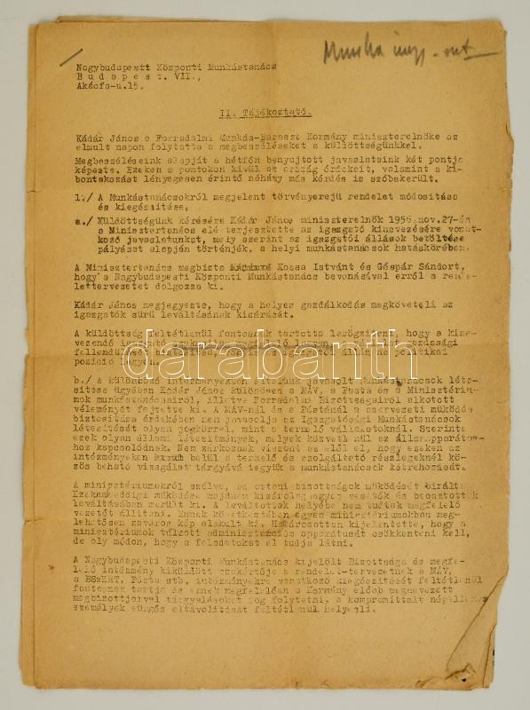 1956 A Nagybudapesi Munkástanács november 29. tájékoztatója, melyben a Munkástanács és Kádár János vezette kormány közötti megbeszélésekről van szó. 3 géppel beírt oldal. Értékes történelmi dokumentum!