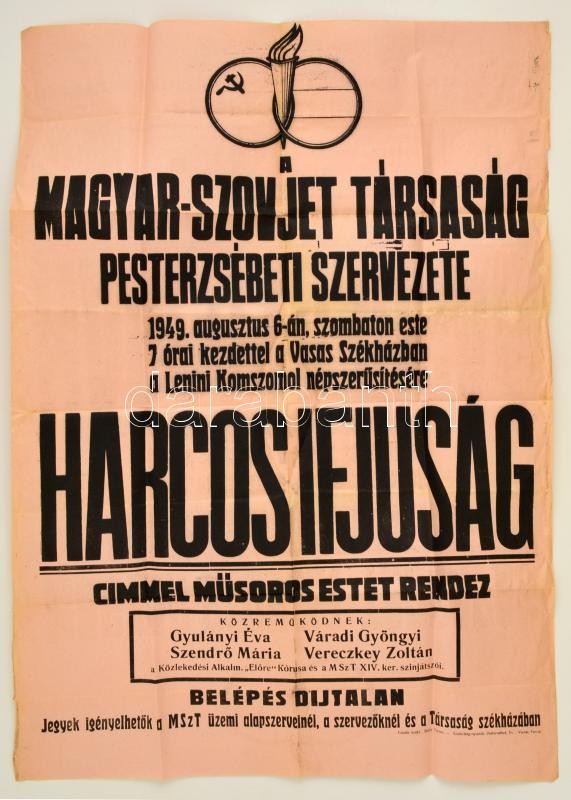 1949 A Magyar-Szovjet Társaság Harcos ifjúság c. műsorának plakátja. 6... https://www.darabanth.com/de/304-Fernauktion/304.0/Andere-Sammelgebiete/Poster~29/1949-A-Magyar-Szovjet-Tarsasag-Harcos-ifjusag-c-musoranak-plakatja-60x80-cm~II1637389
