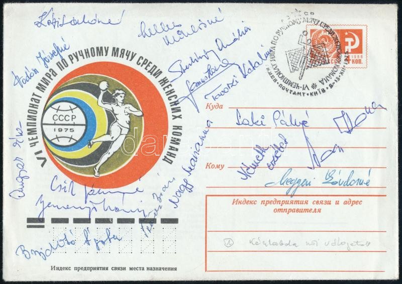 1975 A bronzérmes magyar kézilabda csapat tagjai által aláírt alkalmi boríték Moszkvából a világbajnokságról. Angyal, Vadászné, Kériné, Lelkesné, Sterbinszky, Nagy Mariann, Nagy Ilona, Tavaszi, Lakiné, Tóth Hansági, Csíkné, Bujdosó, Megyeriné, Német. A borítékban a kijevi csapat fotója