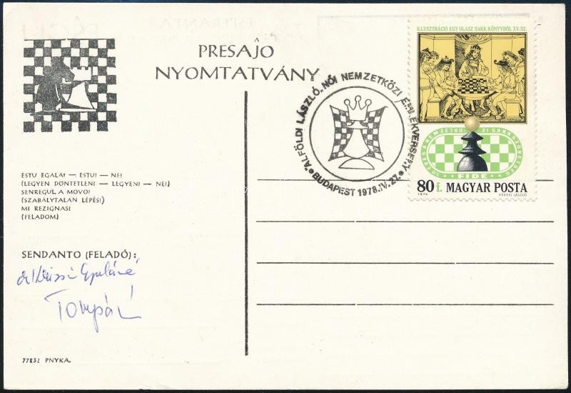 1978 Női sakkverseny mestereinek aláírásai levlezőlapon https://www.darabanth.com/de/304-Fernauktion/304.0/Andere-Sammelgebiete/Signatur~19/1978-Noi-sakkverseny-mestereinek-alairasai-levlezolapon~II1635630