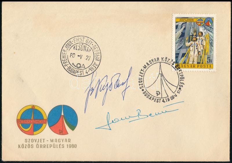 Beschreibung: 1980 Intekozmosz FDC rajta Farkas Bertalan, Valerij Kubaszov űrhajósók saját jezű aláírásaival / Astronauts autograph signatures