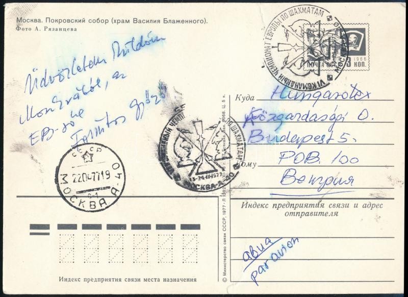 Beschreibung: Forintos Győző nagymester sakkolimpikon üdvözlő képeslapja az 1977 es Sakk Eb ről / Autograph signed postcard of chess master